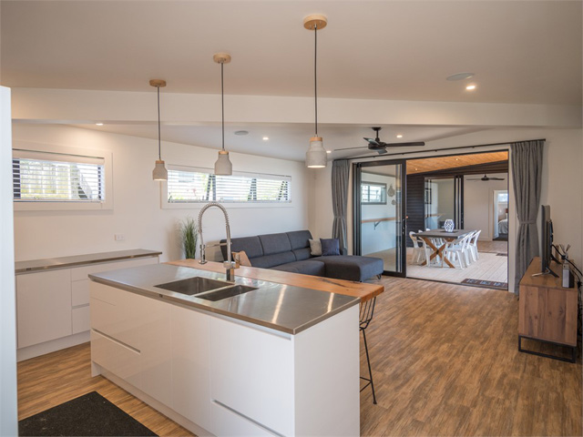 i te moana is a fantastic new addition to the Mangonui Holiday Homes options and comprises four bedrooms two living, and two bathrooms. The main house has two double and one twin bedroom which share the house bathroom. Down the hallway is a modern and well equipped kitchen living and dining area. The mater suite has one double bedroom living area bathroom and kitchenette. These two areas are connected by a expansive covered outdoor dining entertainment area. It’s a design feature that ensures optimum scope for family and friends to be as social or as private as the mood takes you. You can escape the teenagers ….
